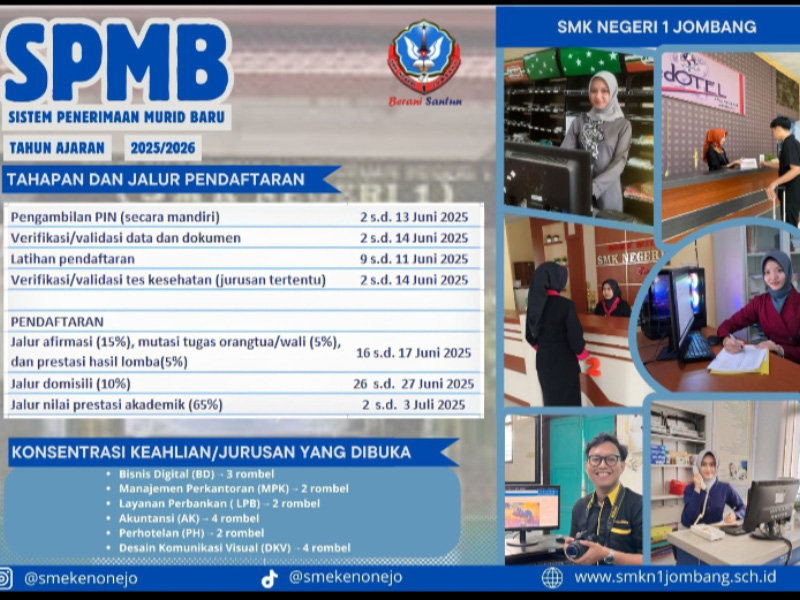 Sistem Penerimaan Siswa Baru 2025-2026 akan dimulai serentak di bulan Juni. Simak informasi berikut untuk bagaimana langkah dan jadwal dari pelaksanaan SPMB SMK NEGERI 1 Jombang. Link juknis SPMB 2025 : https://drive.google.com/drive/folders/1TNckXxOQMuja3DLf0TU1xUZXrlSB8dST?usp=sharing